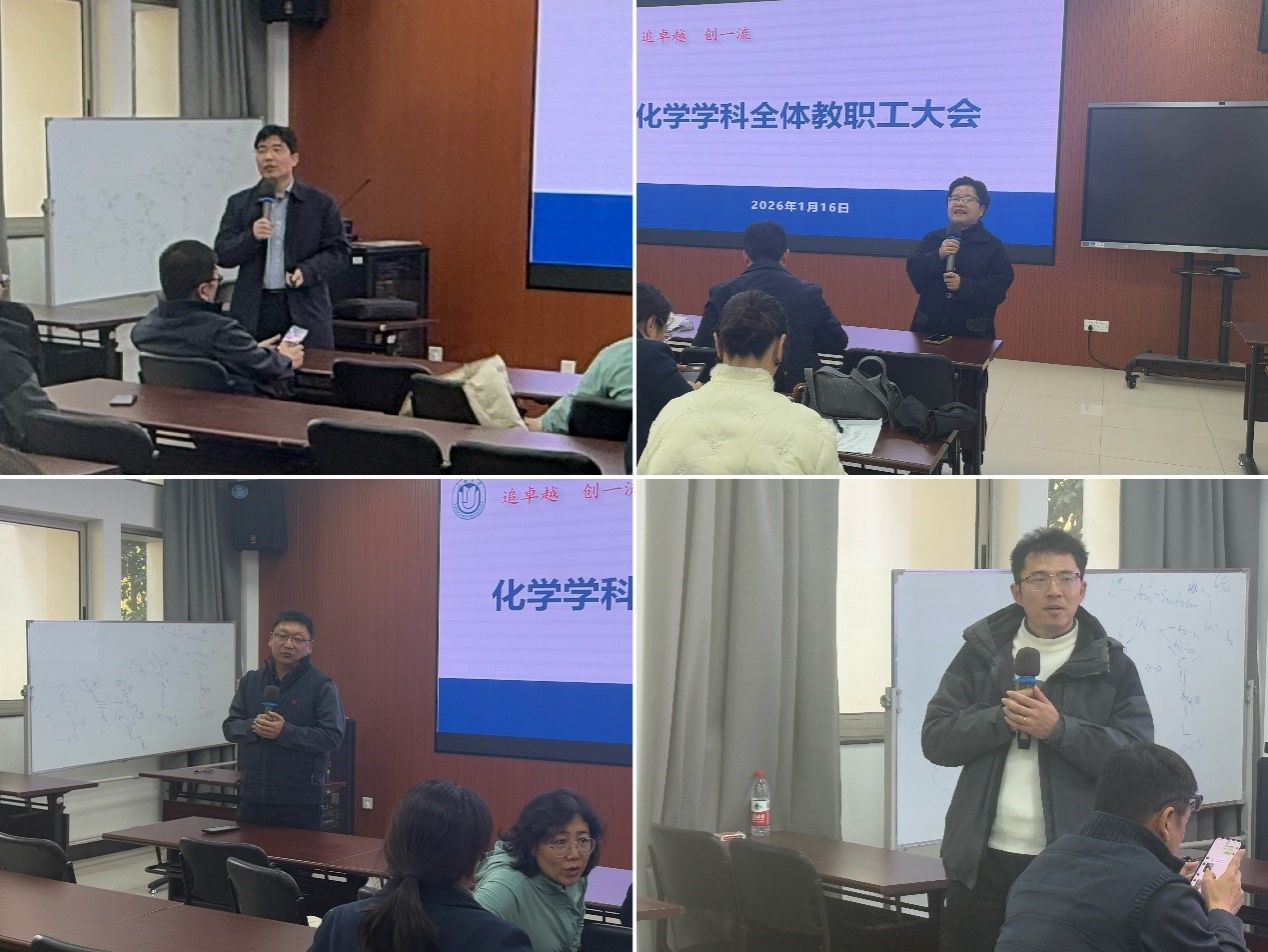 李健在随后发言中传达了近期学院会议精神,并全面回顾了化学学科在学科发展、科研工作、人才队伍建设、实验中心运行等方面的工作和成绩。他对全体教师的辛勤付出与团结奋斗表示感谢,并希望全体教职工在2026年的工作中能够继续迎难而上,协力推动学科发展再创佳绩。