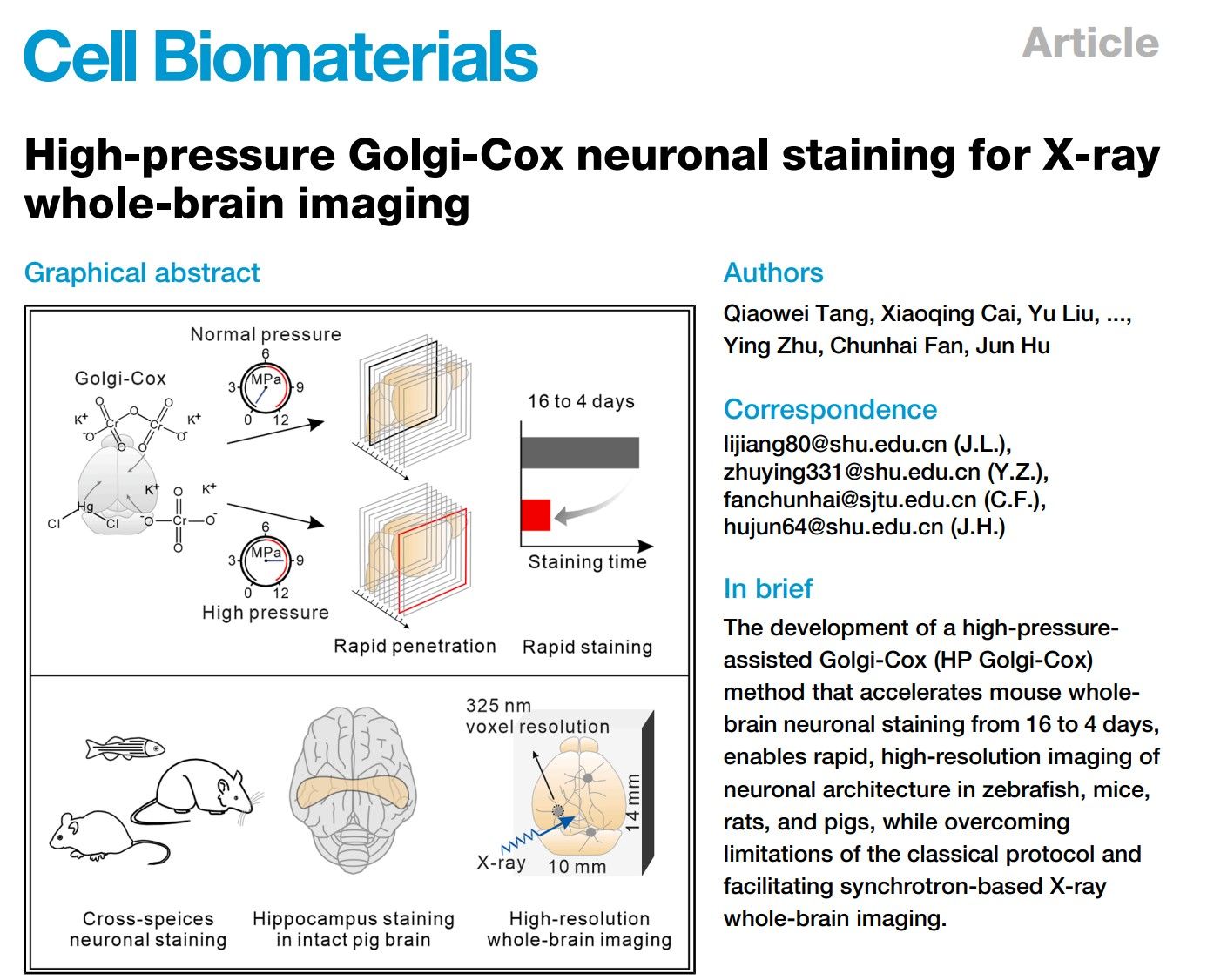近期,36365线路检测中心no1材料生物学研究所胡钧研究员,诸颖研究员,李江研究员联合上海交通大学樊春海院士团队,研发了一种高压辅助Golgi-Cox(HP Golgi-Cox)方法,将小鼠全脑神经元染色时间从 16 天缩短至 4 天,实现了对斑马鱼、小鼠、大鼠和猪等多种动物神经元结构的快速高分辨率X射线成像。该研究成果近期发表在Cell系列期刊《细胞·生物材料》(Cell Biomaterials)杂志上。