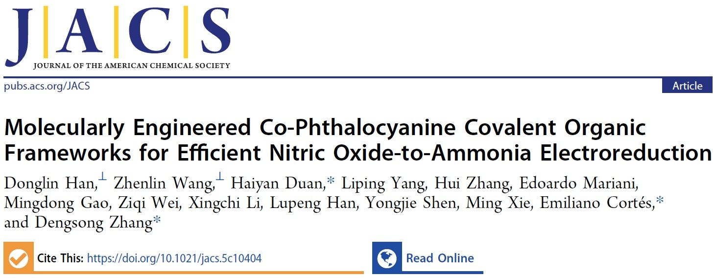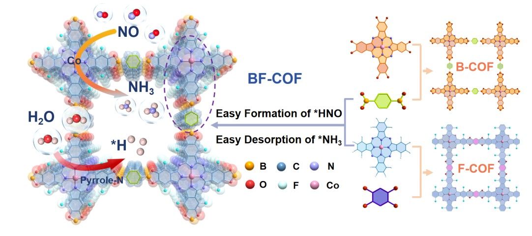 化石燃料燃烧、钢铁冶炼及垃圾焚烧等工业过程排放的氮氧化物,会诱发酸雨、光化学烟雾及细颗粒物生成,既加剧大气污染,又威胁人体健康,实现其持续深度减排与高效净化至关重要。 当前广泛应用的选择性催化还原技术,虽以氨为还原剂可在特定温度下将NO转化为氮气、具备较高实用潜力,却无法回收烟气中的氮资源。而采用电催化还原技术将其转化为氨等高附加值化学品,既能高效回收宝贵氮资源,又能实现烟气氮氧化物的综合治理与资源化,对推动氮循环优化及可持续发展具有关键意义。然而,NORR过程(NO + 5e− + 5H+ → NH3 + H2O)涉及多步质子-电子转移与复杂中间体演变,且易生成多种副产物(如H2, N2, NH2OH, N2H4等)。其核心瓶颈在于催化剂难以精准调控中间体(如HNO/NOH与NH3)的吸附强度:过弱会阻碍加氢步骤,过强则导致NH3脱附困难,从而降低氨产率与法拉第效率。共价有机框架作为一种新兴的通过共价键连接的晶态有机多孔材料,具有可调的周期性孔道、可设计拓扑结构和原子级分散的活性位点,在吸附、催化等领域大放异彩。这类新型共价有机框架为调控催化界面与中间体的吸附强度,揭示复杂的电催化反应机制,追踪催化界面电子和质子的动态演变过程提供了独特的研究视角。