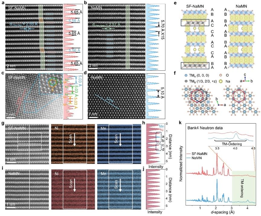 层状过渡金属氧化物正极材料(NaxTMO2)是钠离子电池(SIBs)中一类经典的正极材料,但其实际应用长期面临着高电压下不可逆相变的难题。这一问题会导致材料的比能量与循环稳定性不尽如人意,对于P型(钠离子位于棱柱位)正极材料而言尤为突出。这种现象通常被归因于钠离子脱嵌过程中,其配位环境由棱柱型转变为八面体(O型)构型;在此过程中,过渡金属氧化物TMO2层的滑移与 c 轴晶格的突变往往相伴发生,而针对这一问题的直接解决方案至今仍有待探索。