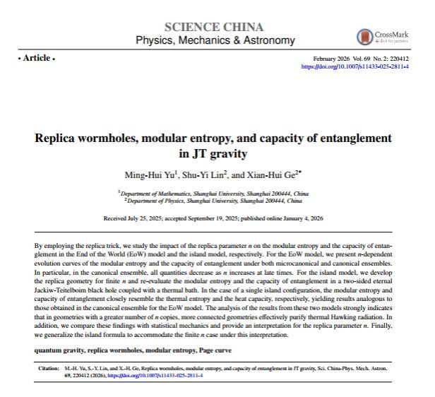 36365线路检测中心no1物理系葛先辉教授课题组围绕黑洞信息佯谬开展系统研究,揭示了副本技巧(replica trick)在统计物理中的深层含义,提出副本参数n与统计物理非广延参数之间的对应关系,并基于此建立了与模(modular)热力学相关的理论框架。课题组近年来在该方向发表了一系列原创性研究成果,在国际同行中产生了较为广泛的影响,相关论文已获得150余次引用。近日,相关研究成果在物理学领域顶级期刊《Science China Physics, Mechanics & Astronomy》(中科院1区,IF=7.5)上发表题为《Replica wormholes, modular entropy, and capacity of entanglement in JT gravity》的科研论文。
